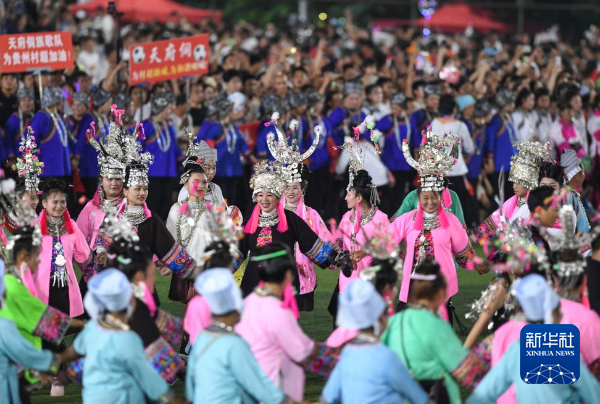 这是村民在“村超”足球赛中场休息时间表演苗族芦笙舞(6月17日摄)。新华社记者 杨文斌 摄