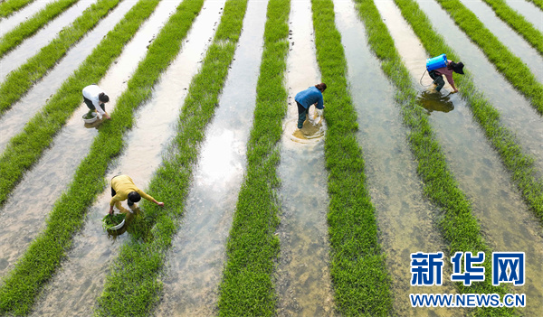 日前,工人在岑巩县的水稻制种基地管护水稻。新华网发(陈昆 摄)