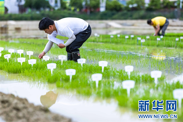 4月29日,技术人员在贵州省黔东南苗族侗族自治州岑巩县杂交水稻制种试验田查看水稻长势。新华社发(陈熙摄)