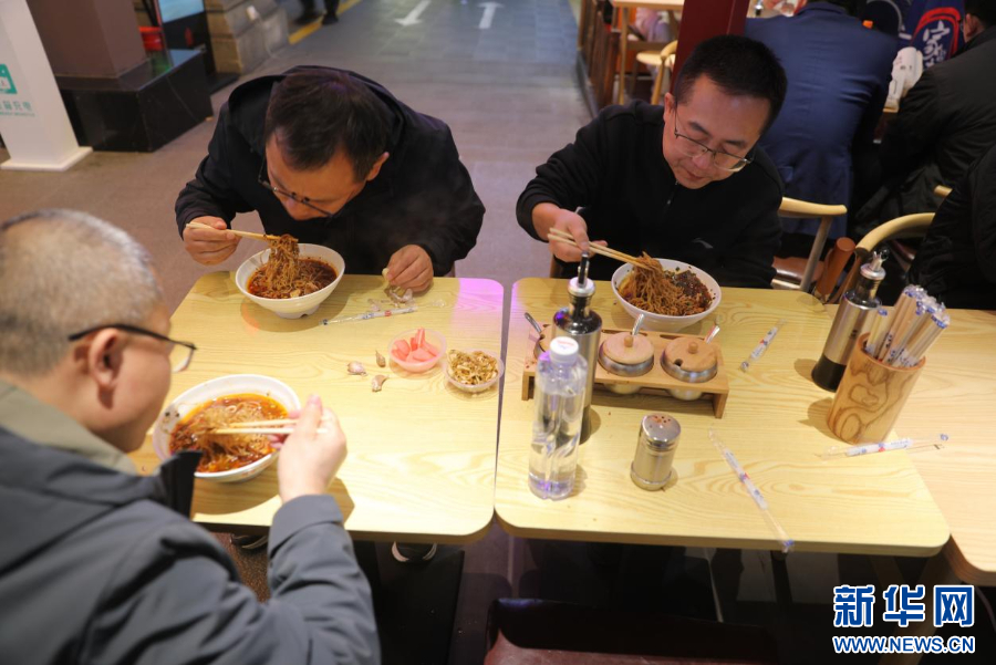 3月14日,贵阳青云路步行街“青云不夜城”内,来自山东的游客正在品尝肠旺面。新华网发(石建生 摄)