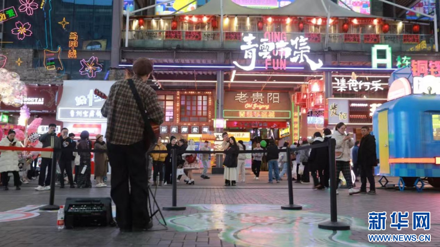 3月14日,贵阳青云路步行街“青云市集”,歌手在进行吉他弹唱表演。新华网发(石建生 摄)