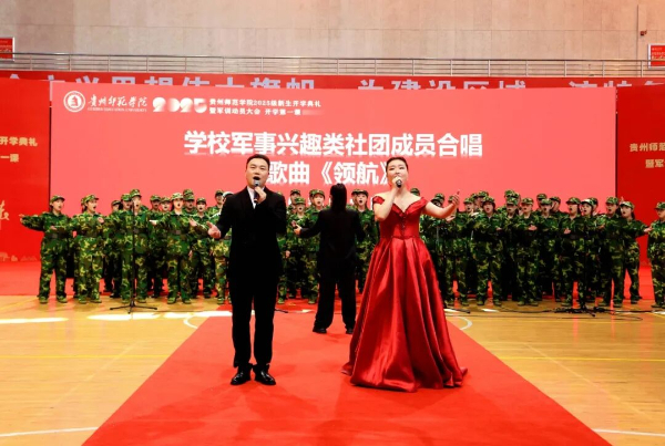 在家校领导,贵阳市乌当区人民武装部部长袁永伟,优秀校友、贵阳市南明小学校长唐银乔出席典礼,学校各职能部门负责人,各学院党委书记、院长、副书记、教师代表、辅导员、新生班班主任参加典礼。典礼由校党委委员、副校长陈真波主持。